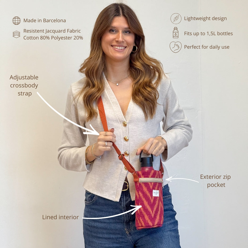 Bolso porta botellas. Con un tejido grueso de jacquard 80% algodón y 20% poliéster con estampado tipo zigzag de color fucsia y naranja. Forrado de tejido grueso de color gris en la parte interior. Con asa de cinta de algodón de color rosa fucsia regulable para llevar cruzado. Con bolsillo exterior con cremallera. Caben botellas de hasta 1,5L.