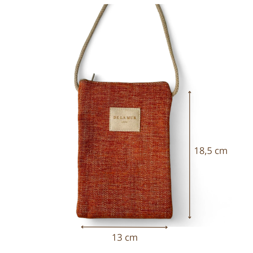 Bolsito porta móvil para llevar tipo bandolera, con cremallera en la parte superior y cordón largo de algodón de color beige. Con un tejido liso efecto desgastado de color teja. Forrado de tejido grueso de color gris en la parte interior. Etiqueta de marca de polipiel. Para su correcto mantenimiento se aconseja lavarlo en frío a mano y no utilizar secadora.