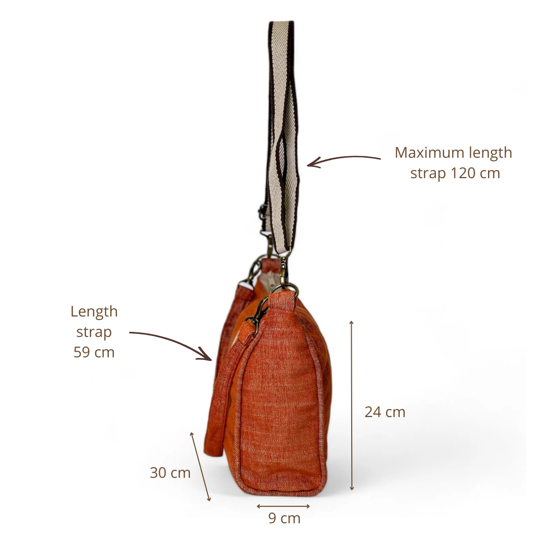 Bolso mediano con asa larga ajustable y un asa corta de tejido. Con un tejido liso efecto desgastado de color teja. Opción de llevarlo al hombro o como bandolera. Bolsillo interior con cremallera y bolsillo exterior grande con cremallera. Asa de cinta de espiga de algodón de color beige con lurex con marrón en los laterales. Etiqueta de marca de polipiel. Para su correcto mantenimiento se aconseja lavarlo en frío y no utilizar secadora.