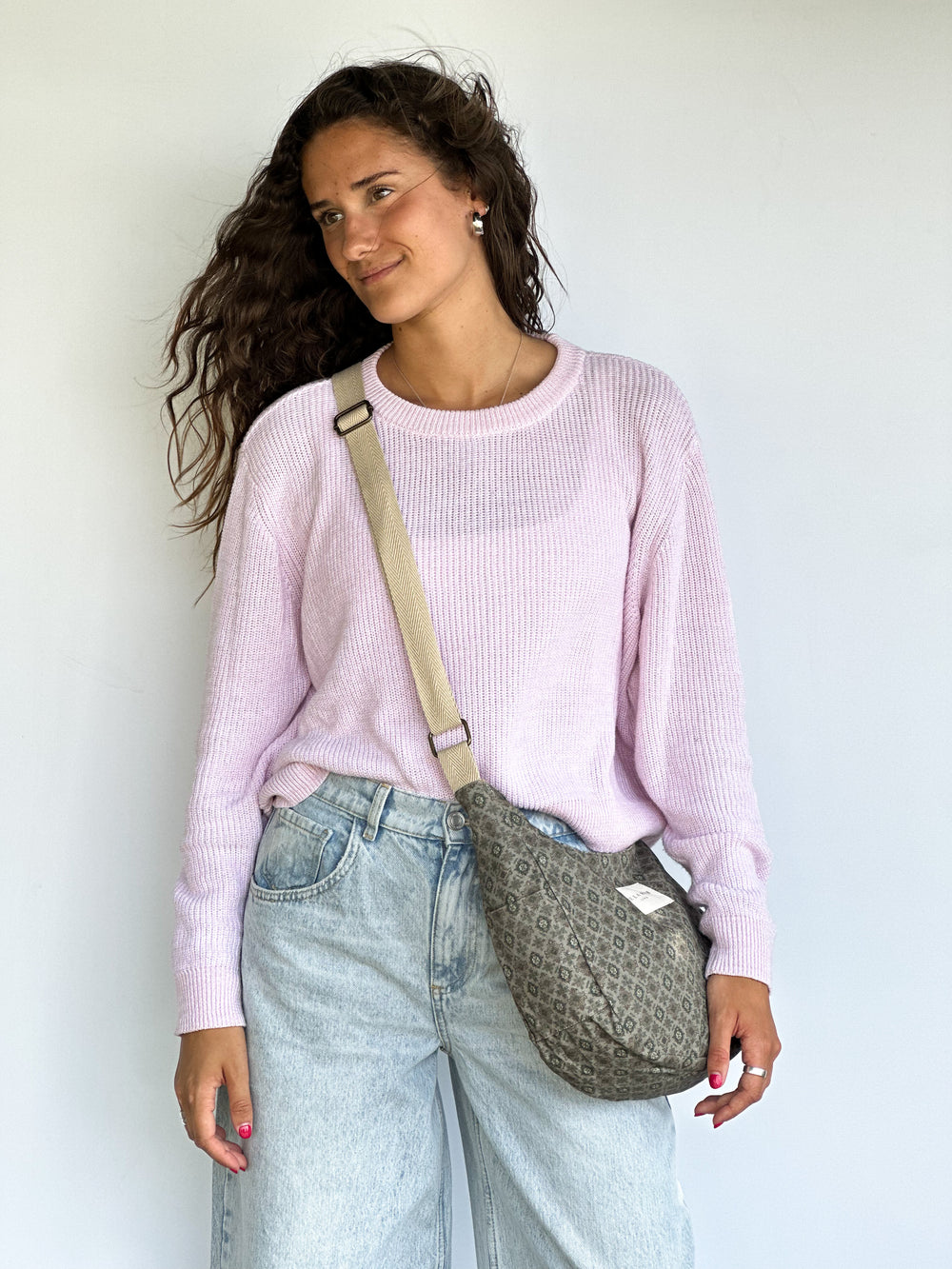 Bolso luna tipo bandolera con asa larga ajustable de cinta de espiga de algodón de color beige. Cierre superior con cremallera. Bolsillos laterales sin cremallera. Con tejido fino con estampado geométrico de color verde caqui. Forrado de tejido grueso de color gris en la parte interior. Bolsillo interior con cremallera. Para su correcto mantenimiento se aconseja lavarlo en frío a mano y no utilizar secadora.