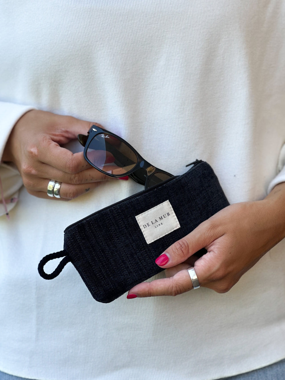 Funda de gafas con cremallera en la parte superior y pequeña asa de cordón de color negro en el lateral. Con tejido grueso de terciopelo negro. Forrado de tejido grueso de color gris en la parte interior. Para su correcto mantenimiento se aconseja lavarlo en frío a mano y no utilizar secadora.