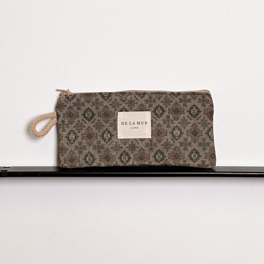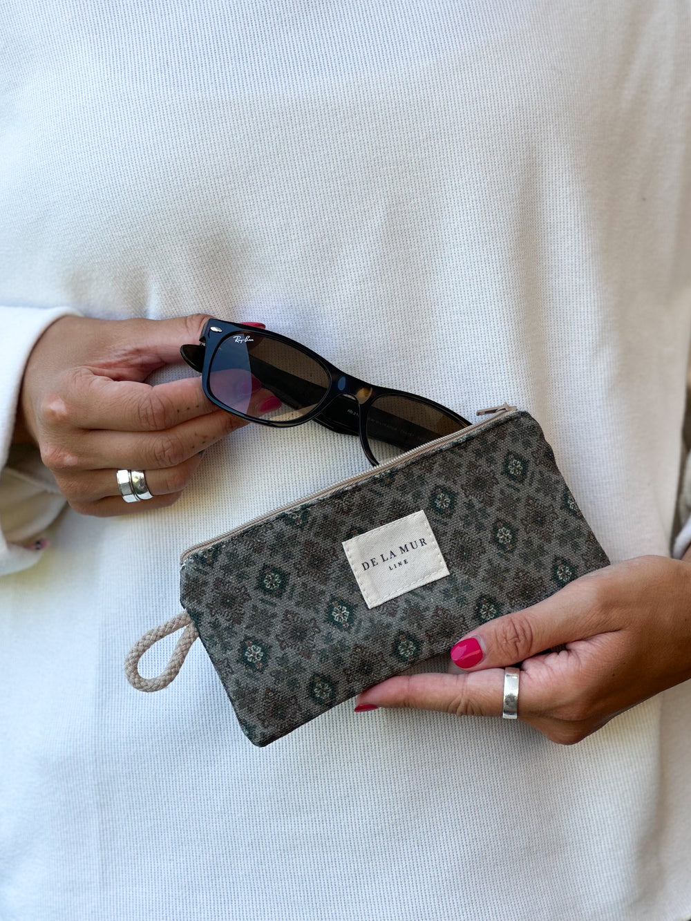 Funda de gafas con cremallera en la parte superior y pequeña asa de cordón de color beige en el lateral. Con tejido fino con estampado geométrico color verde caqui. Forrado de tejido grueso de color gris en la parte interior. Para su correcto mantenimiento se aconseja lavarlo en frío a mano y no utilizar secadora.
