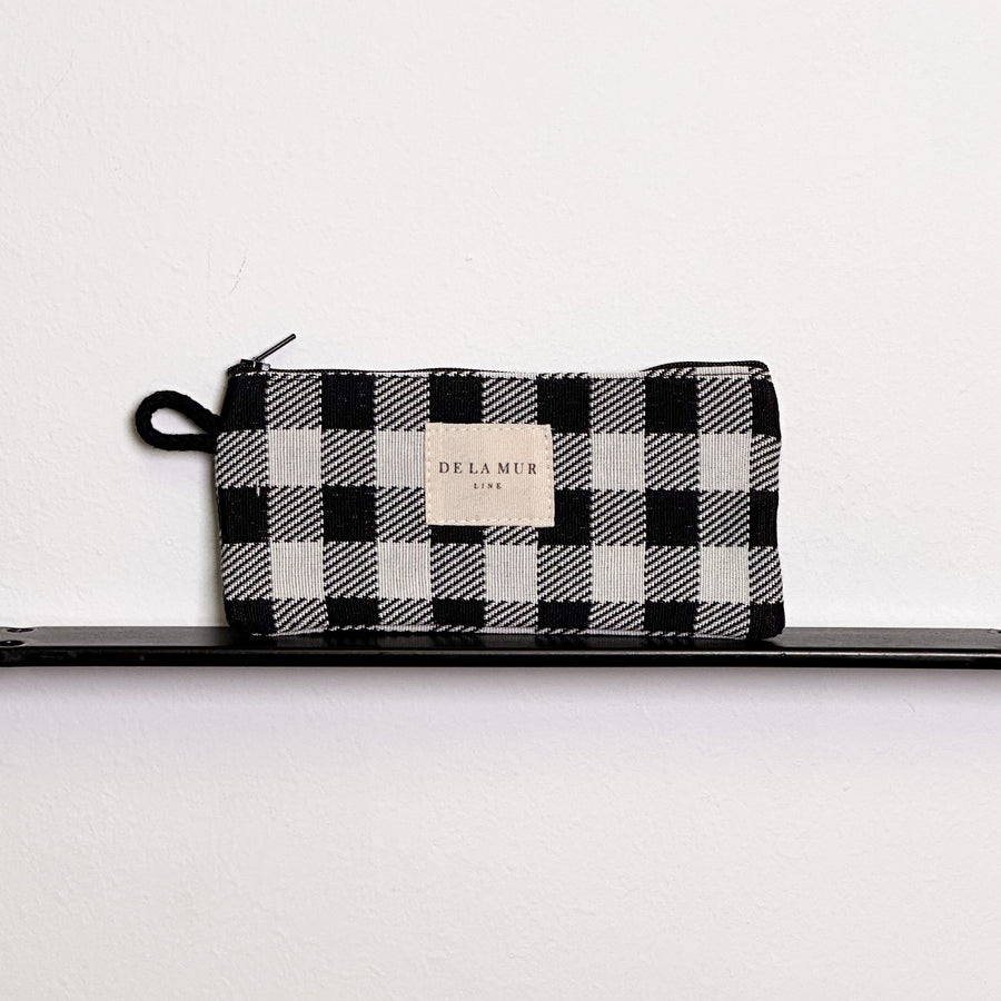 Funda de gafas con cremallera en la parte superior y pequeña asa de cordón de color negro en el lateral. Con tejido grueso con estampado a cuadros vichy de color blanco y negro. Forrado de tejido grueso de color gris en la parte interior. Para su correcto mantenimiento se aconseja lavarlo en frío a mano y no utilizar secadora.