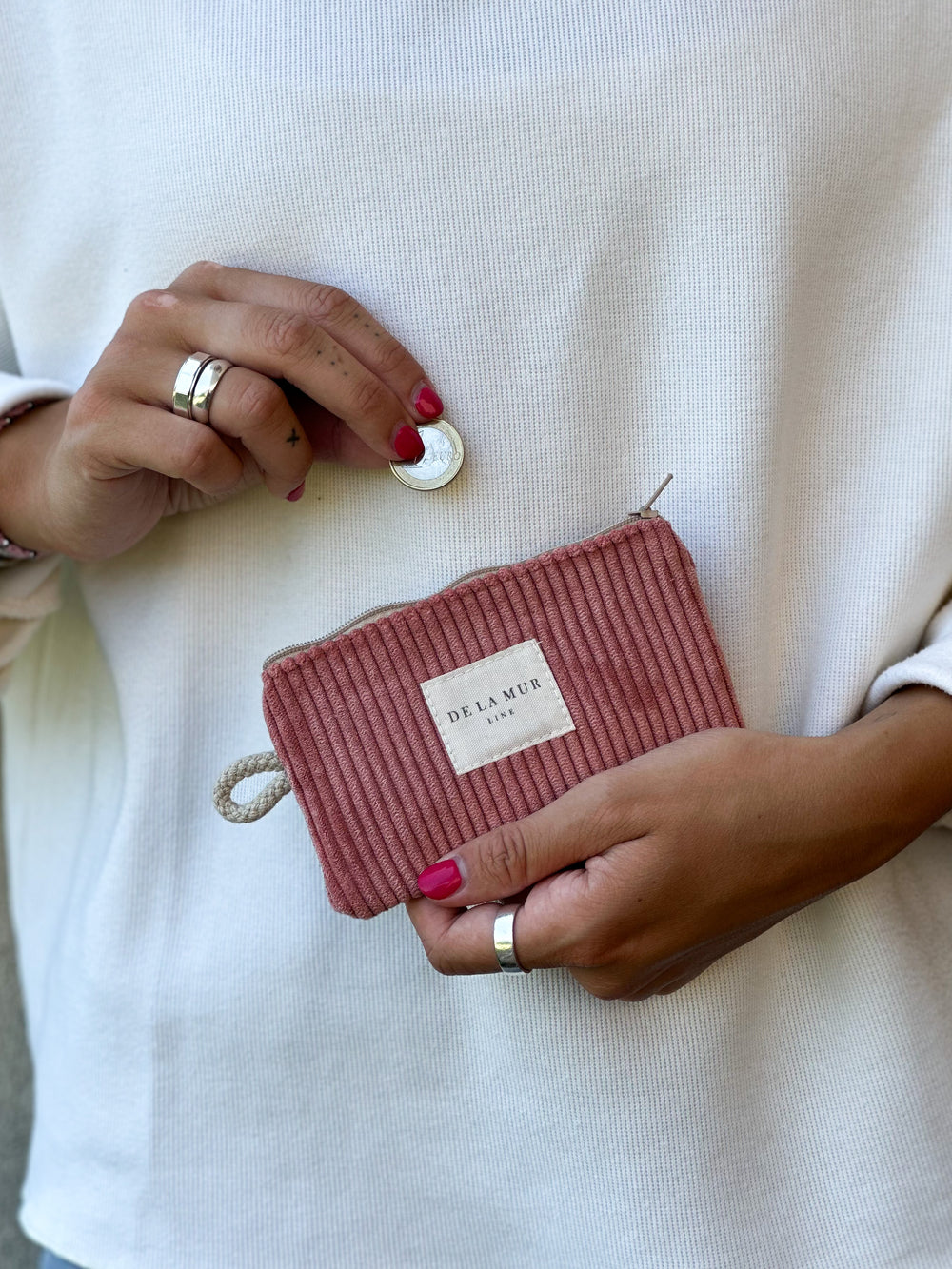 Monedero con cremallera en la parte superior y pequeña asa de cordón de color beige en el lateral. Con tejido grueso de pana de color coral. Forrado de tejido grueso de color gris en la parte interior. Para su correcto mantenimiento se aconseja lavarlo en frío a mano y no utilizar secadora.