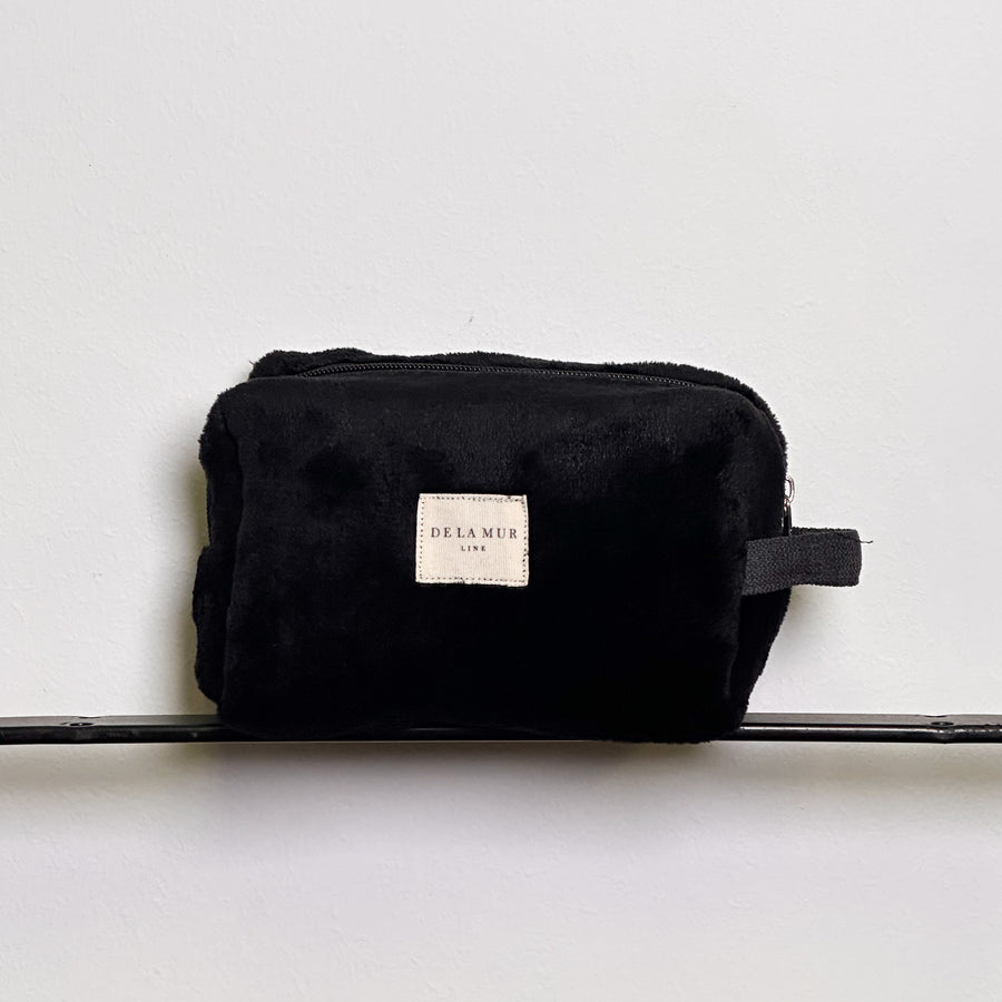Neceser mediano con cremallera en la parte superior y con asa lateral. Con tejido grueso de pelo suave negro. Forrado de tejido grueso de color gris en la parte interior. Para su correcto mantenimiento se aconseja lavarlo en frío a mano y no utilizar secadora.