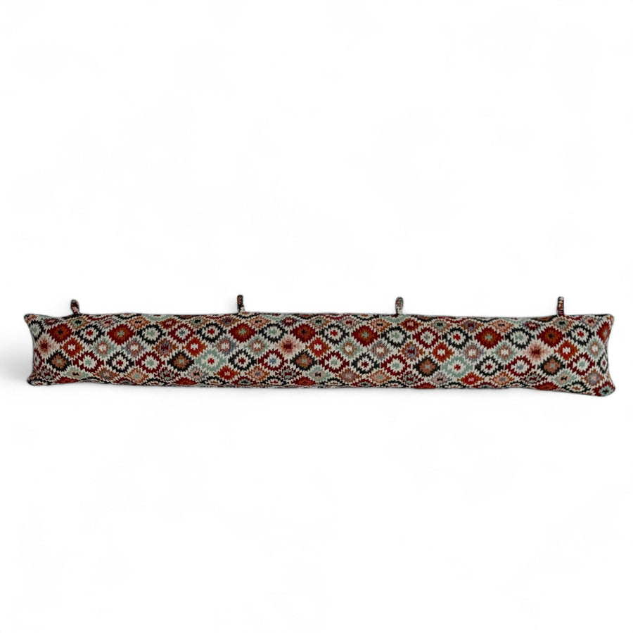 Cortavientos con relleno. Con pequeñas asas para colgar en la puerta. Con tejido de jacquard con estampado geométrico en tonos rojos y verdes. Para su correcto mantenimiento se aconseja lavarlo en agua fría y no utilizar secadora.