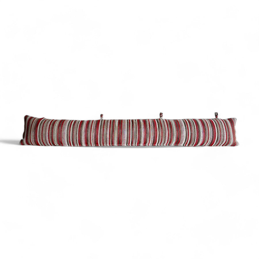 Cortavientos con relleno. Con pequeñas asas para colgar en la puerta. Con tejido grueso de jacquard con estampado a rayas en tonos marrón y granate. Para su correcto mantenimiento se aconseja lavarlo en frío y no utilizar secadora.