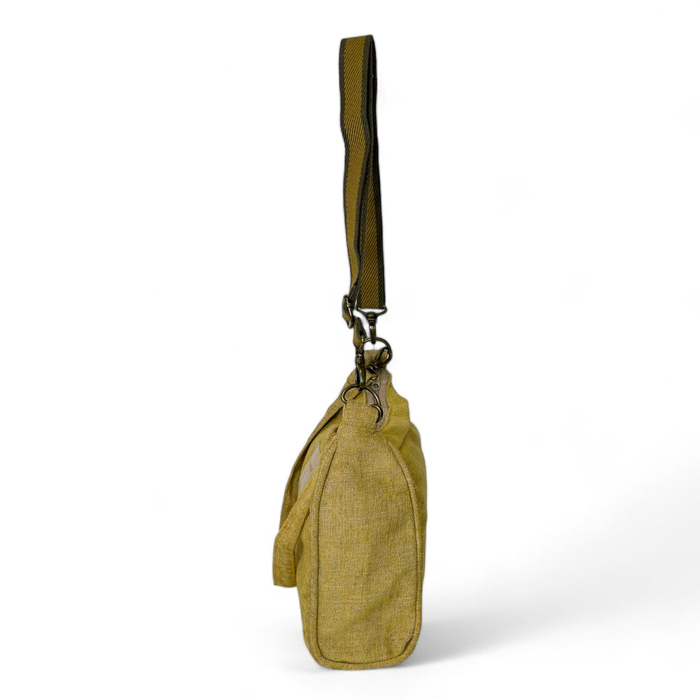 Bolso mediano con asa larga ajustable y un asa corta de tejido. Con un tejido liso efecto desgastado de color ocre. Opción de llevarlo al hombro o como bandolera. Bolsillo interior con cremallera y bolsillo exterior grande con cremallera. Asa de cinta de espiga de algodón de color ocre con verde caqui en los laterales. Etiqueta de marca de polipiel. Para su correcto mantenimiento se aconseja lavarlo en frío y no utilizar secadora.