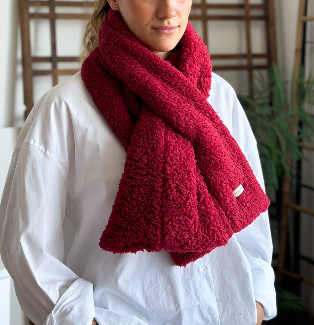 Cuello buf con tejido grueso de borreguito de color granate, suave y cálido. Para su correcto mantenimiento se aconseja lavarlo en frío y no utilizar secadora.