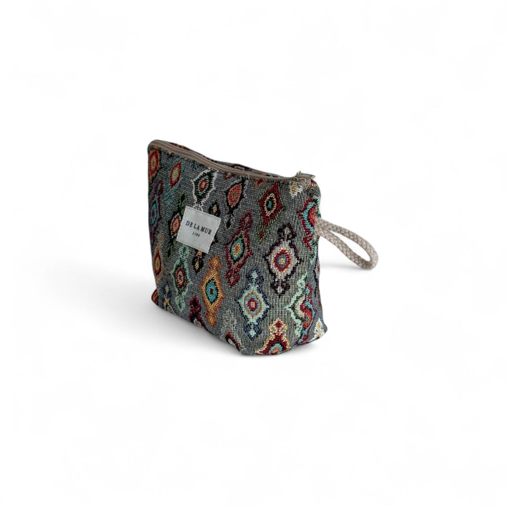 Neceser pequeño con cremallera en la parte superior y con asa lateral de cordón de color beige. Con tejido grueso de jacquard con estampado geométrico multicolor sobre fondo gris. Cada articulo puede tener una variación en el estampado, dependiendo de donde se haya efectuado el corte de la pieza. Para su correcto mantenimiento se aconseja lavarlo en frío y no utilizar secadora.