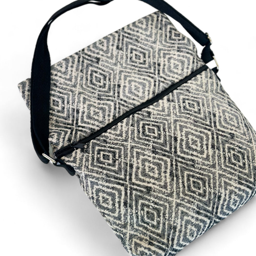 Bolso solapa mini tipo bandolera con asa larga ajustable de cinta de espiga de algodón de color negro. Con un tejido grueso de jacquard con estampado geométrico en tonos gris oscuro. Cierre superior con cremallera. Bolsillo con cremallera exterior bajo la solapa. Forrado de tejido grueso de color gris en la parte interior. Bolsillo interior con cremallera. Para su correcto mantenimiento se aconseja lavarlo en frío a mano y no utilizar secadora.