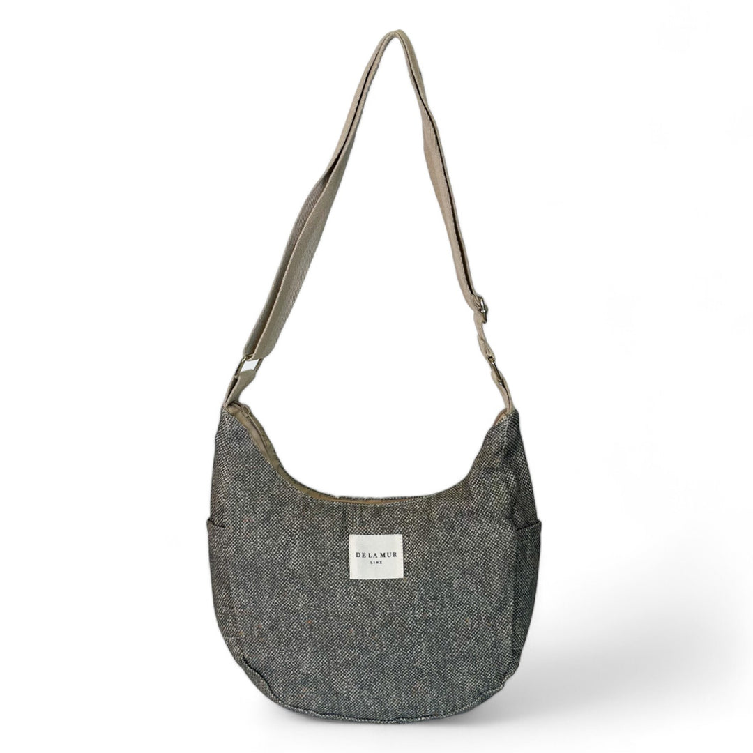 Bolso luna tipo bandolera con asa larga ajustable de cinta de espiga de algodón de color beige. Cierre superior con cremallera. Bolsillos laterales sin cremallera. Con tejido fino con estampado tipo saco de color caqui oscuro. Forrado de tejido grueso de color gris en la parte interior. Bolsillo interior con cremallera. Para su correcto mantenimiento se aconseja lavarlo en frío a mano y no utilizar secadora.