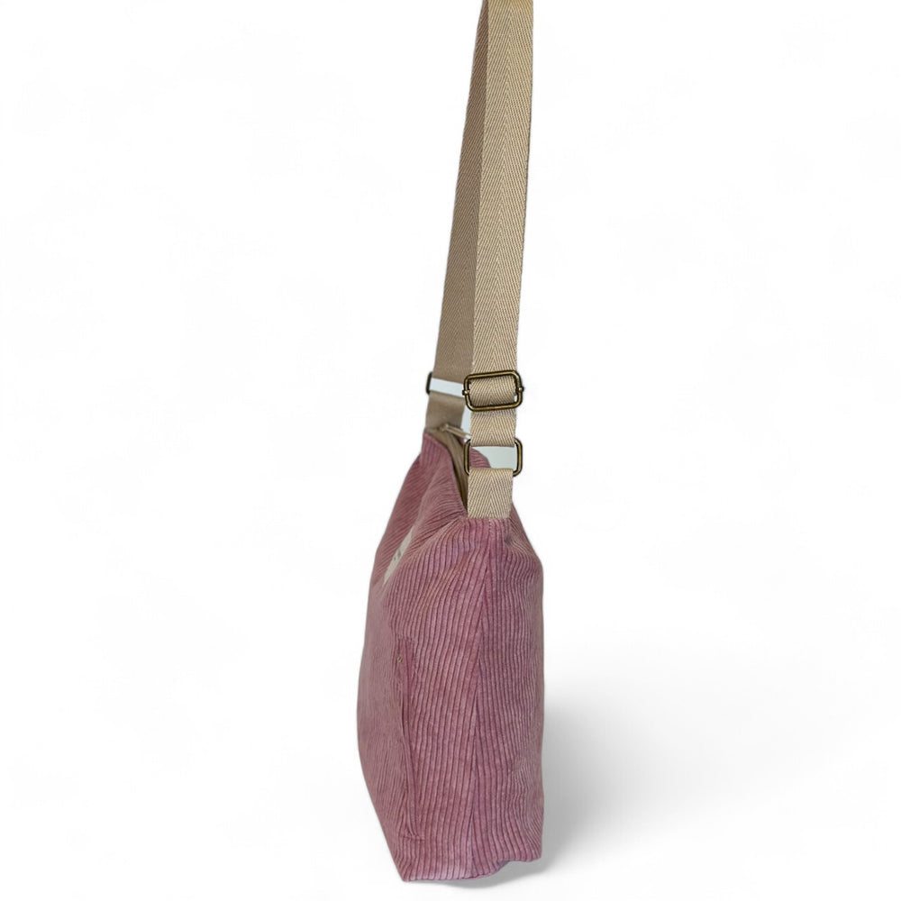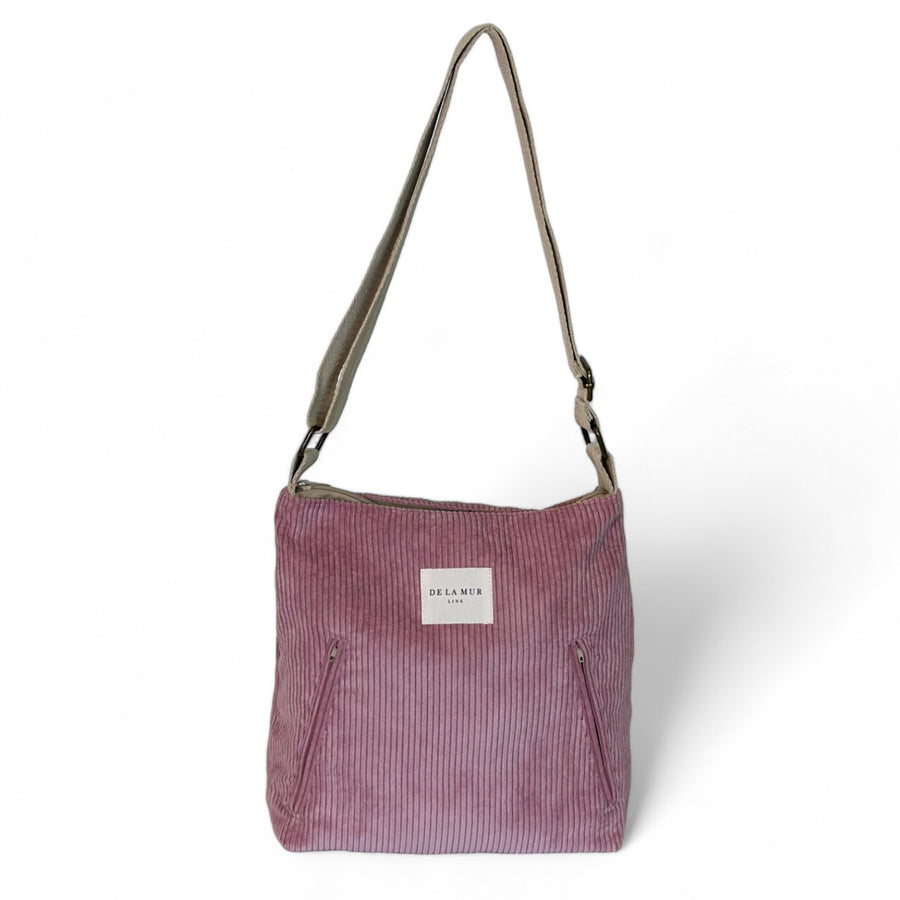 Bolso mediano tipo bandolera con asa larga ajustable de cinta de espiga de algodón de color beige. Con un tejido grueso de pana de color rosa. Cierre superior con cremallera. Dos bolsillos en la parte frontal con cremallera. Forrado de tejido grueso de color gris en la parte interior. Bolsillo interior con cremallera. Para su correcto mantenimiento se aconseja lavarlo en frío a mano y no utilizar secadora.