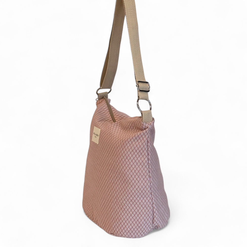Bolso saco tipo bandolera con asa larga ajustable de cinta de espiga de algodón de color beige. Cierre superior con cremallera. Con tejido fino con textura de color rosa maquillaje. Forrado de tejido grueso de color gris en la parte interior. Bolsillo interior con cremallera. Para su correcto mantenimiento se aconseja lavarlo en frío a mano y no utilizar secadora.