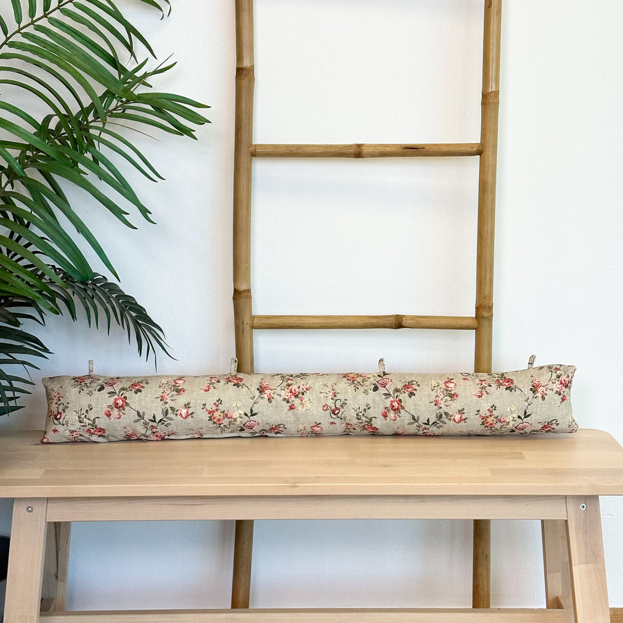 Cortavientos con relleno. Con pequeñas asas para colgar en la puerta. Con tejido con estampado floral en tonos rojizos. Para su correcto mantenimiento se aconseja lavarlo en frío y no utilizar secadora.