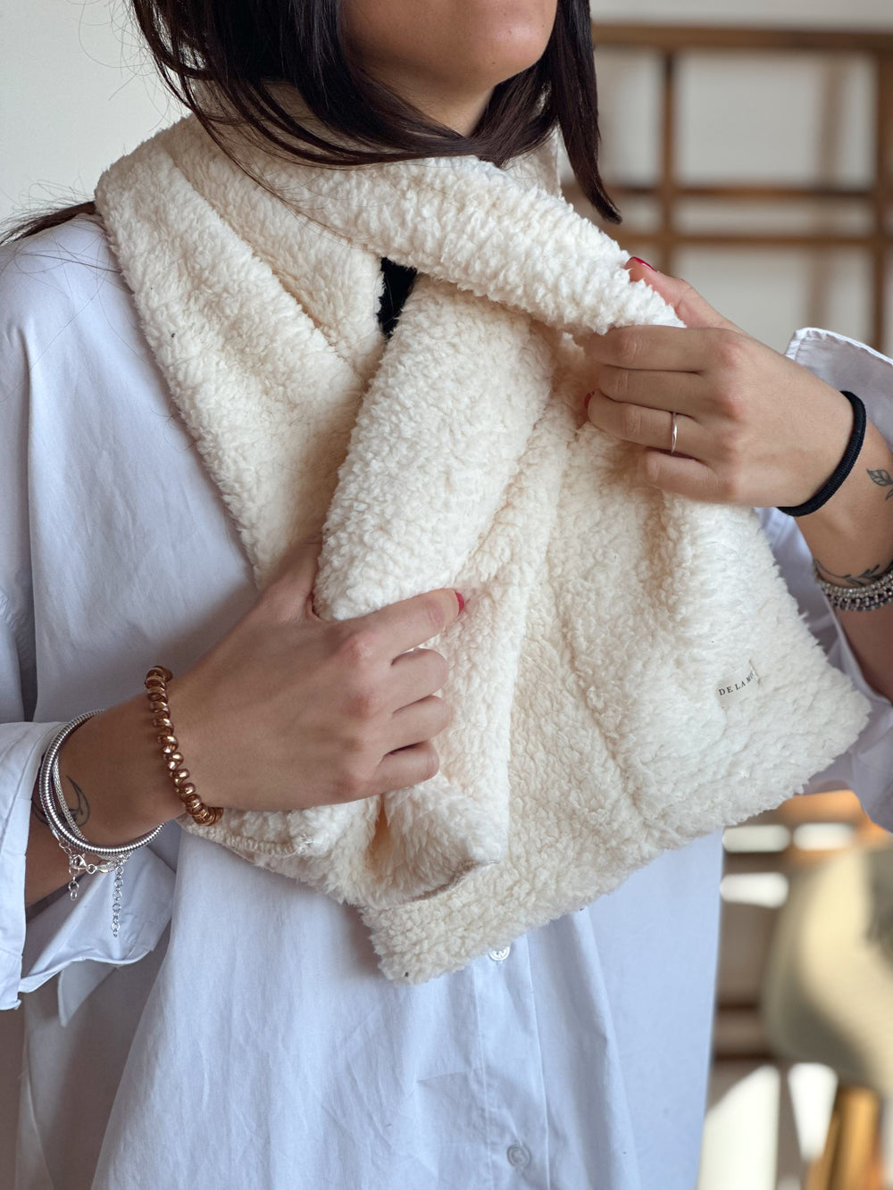 Cuello buf con tejido grueso de borreguito de color crudo, suave y cálido. Para su correcto mantenimiento se aconseja lavarlo en frío y no utilizar secadora.