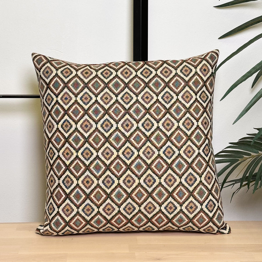 Funda de cojín sin relleno. Combinado con dos tejidos diferentes, un tejido con estampado geométrico multicolor por una cara, y un tejido liso de color yute por la otra. Para su correcto mantenimiento se aconseja lavarlo en frío y no utilizar secadora.
