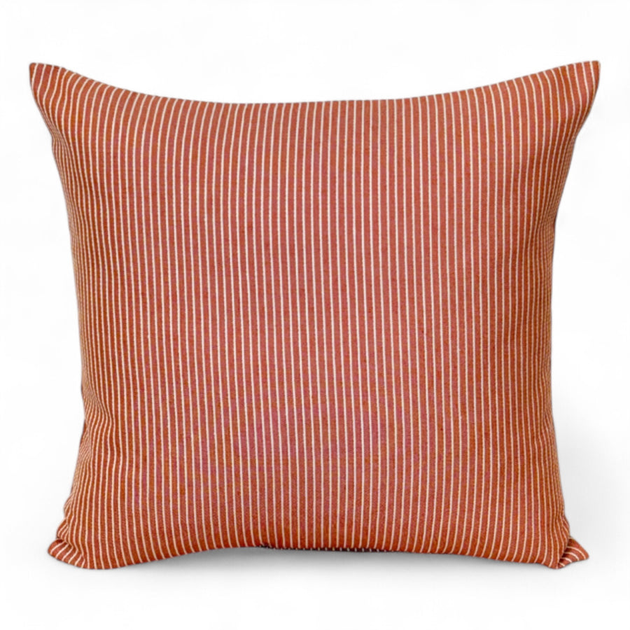 Funda de cojín sin relleno. Con tejido con textura con estampado a rayas crudas sobre fondo caldera. Para su correcto mantenimiento se aconseja lavarlo en frío y no utilizar secadora.
