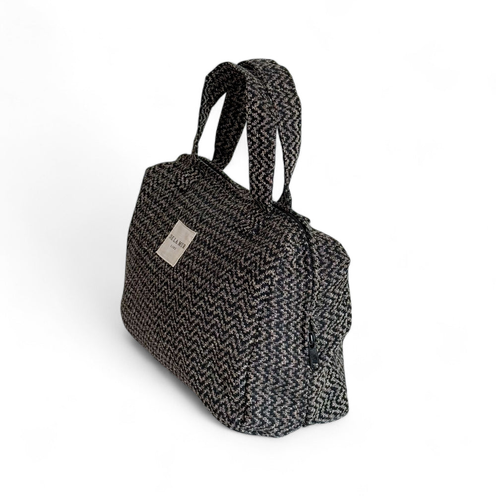 Neceser extra grande con cremallera en la parte superior y asas de tela en la parte superior. Con tejido grueso de jacquard con estampado tipo zigzag de color negro y beige. Forrado de tejido grueso de color gris en la parte interior. Para su correcto mantenimiento se aconseja lavarlo en frío a mano y no utilizar secadora.
